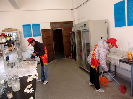 3月10日,医学一系2009级青年志愿者自发来到基础部,开展了清理实验室,美化校园环境志愿者活动。09级志愿者们分成两组,一组打扫学生实验室,另一组清扫实验室办公区域。大家不畏辛劳,认真擦拭桌面、实验设备和窗户,清扫地面,不放过任何一个卫生死角。经过大家的努力,实验室更加整洁和卫生,受到了实验室老师们的一致好评。